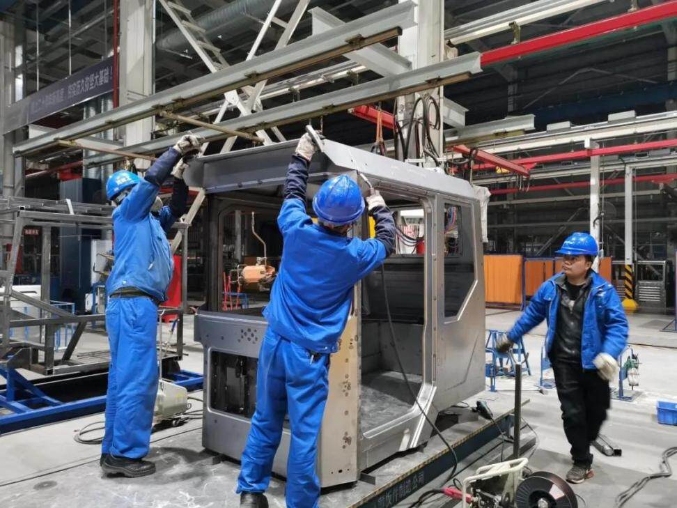 设计完成后,生产部门组织了攻坚队,加班加点的赶工期,全力冲刺投产节点。现场施工及时调整工序、优化施工方案、进行高效管控,生产现场井然有序。生产部长伍阔祥和工艺所长黎忠伟通宵达旦守在现场,终于在2021年2月2日完成了首台矿卡驾驶室的试装。