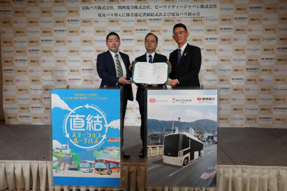 2021年2月24日,比亚迪日本有限公司与京阪巴士有限公司和关西电力有限公司在日本京都宣布达成三方合作。三方将携手助力京都实现日本2050年碳中和目标,共建无碳社会。