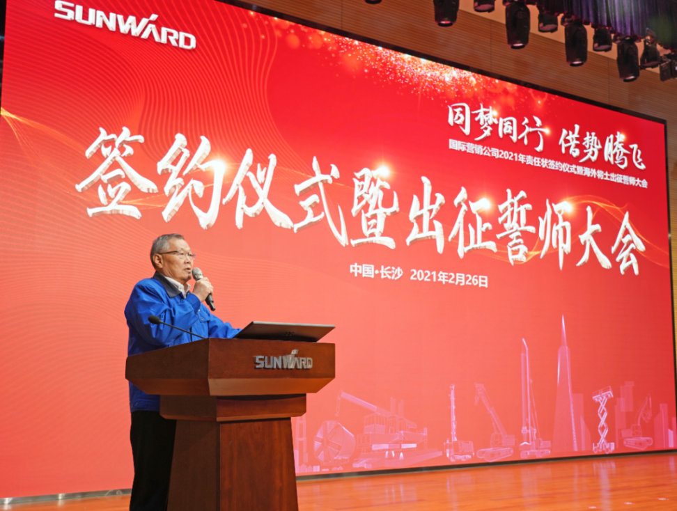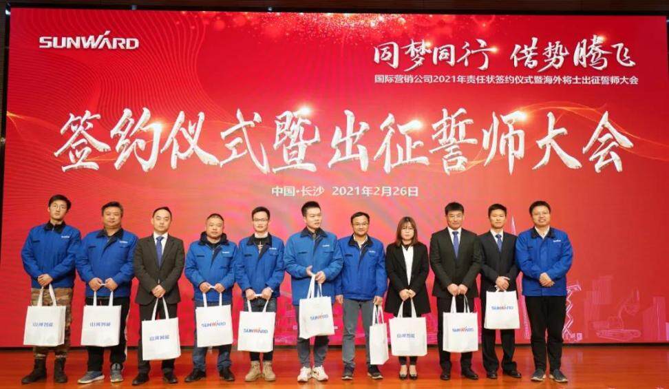 2021年2月26日,值农历正月十五元宵佳节,山河智能举行国际营销团队出征海外誓师会,公司董事长何清华、总经理付向东、副总经理龙居才、人力资源总监肖伟、国际营销公司总经理赵立军、事业部领导朱振新、范峥嵘、舒敏飞等出席。