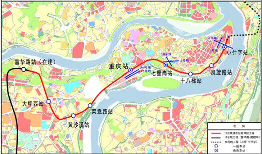 18号线北延伸段(富华路~小什字)全长11公里,投资100亿元,设大坪西站、黄沙溪站、菜袁路站、重庆站、七星岗站、十八梯站、凯旋路站、小什字站共8座车站。