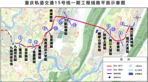15号线(曾家~江北机场T3航站楼~两江影视城)全长67公里,分一、二期建设。15号线是重庆市第一条联通东中西三大槽谷的城轨快线,设计时速达140公里/小时,实现科学城、礼嘉智慧城、两江协同创新区快速联系,并串联江北机场、科学城铁路枢纽、复盛高铁站等主要交通枢纽,将有力带动中心城区一体化发展,并预留与主城新区城轨快线贯通运营条件。
