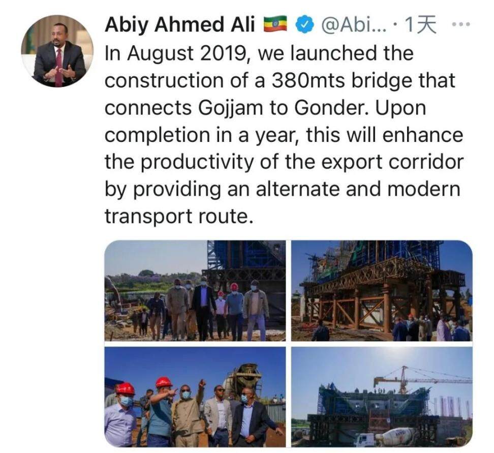 2021年3月8日,埃塞俄比亚总理阿比·艾哈迈德·阿里到中交一公局集团承建的巴哈达尔斜拉桥项目考察调研,并通过社交媒体点赞项目建设工作。