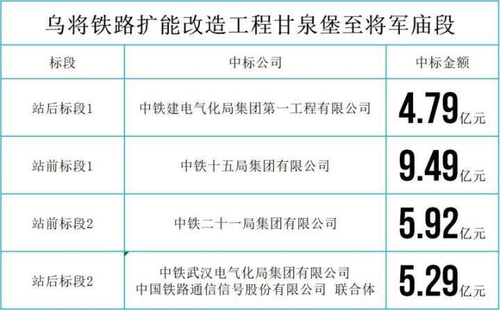 2021年3月4日,乌将铁路扩能改造工程甘泉堡至将军庙段中标结束,该工程分为四段建造,站前站后各两段,四家企业同时施工,总投资25.2亿元。