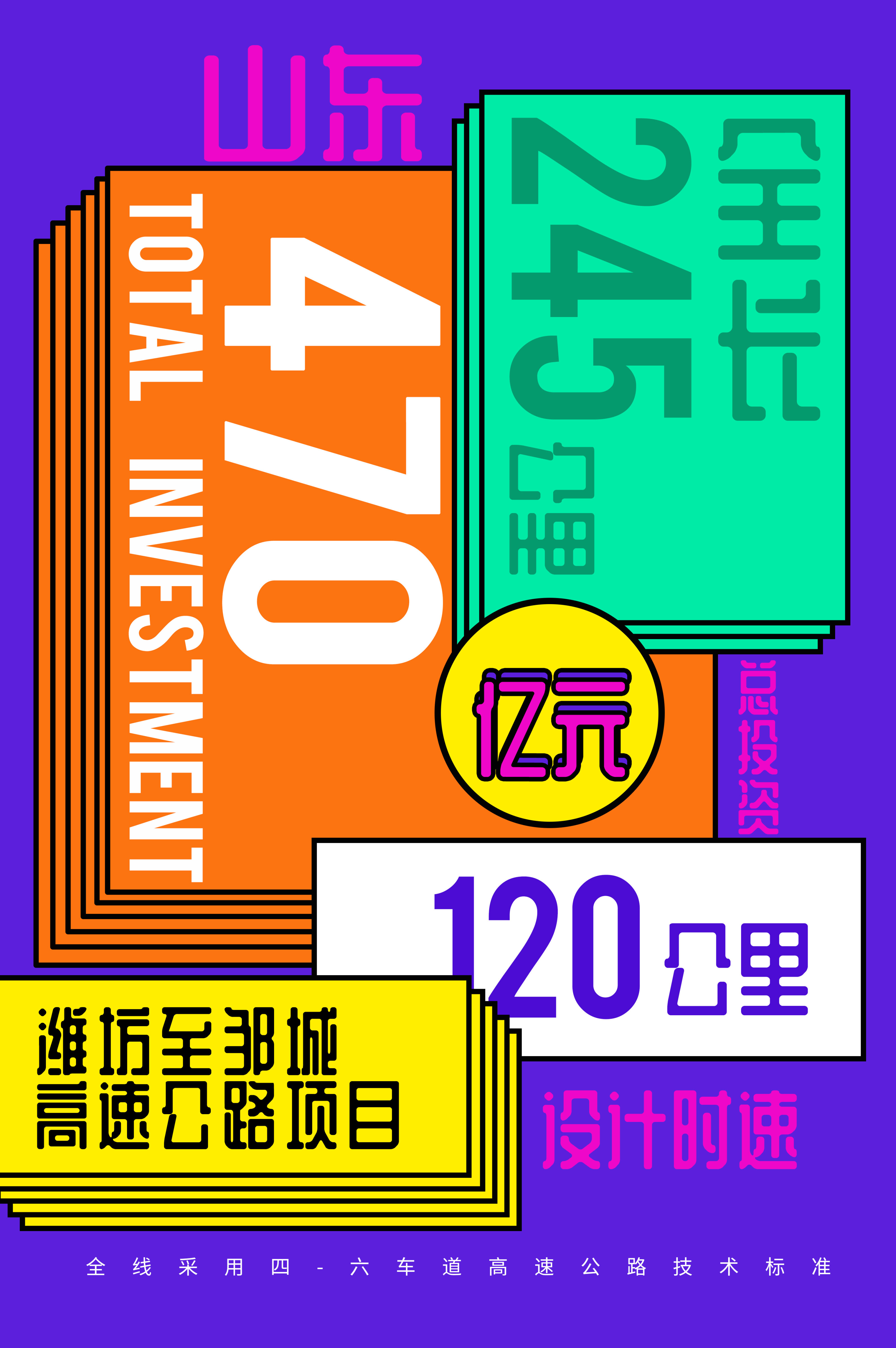 潍坊至邹城高速公路项目:全长245公里,投资估算470亿元。项目起自潍坊至青岛高速公路起点,向西经临朐南部、沂源东部、蒙阴西北部、平邑西北部,止于邹城南部,接规划济宁至邹城高速公路。全线采用四-六车道高速公路技术标准,设计速度120公里/小时,路基宽度34.5米。