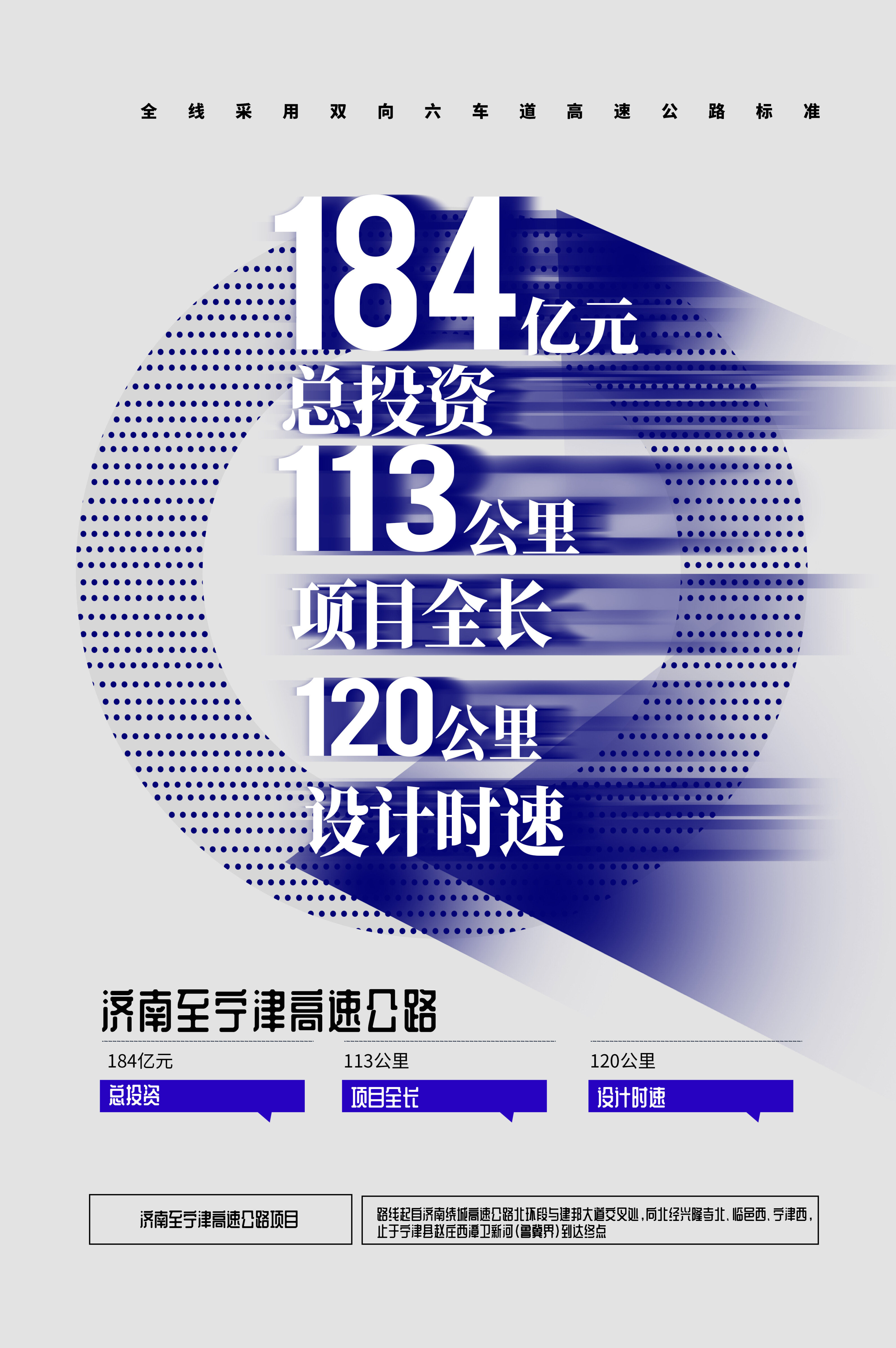 济南至宁津高速公路项目:全长113公里,投资估算184亿元。工可推荐方案路线起自济南绕城高速公路北环段与建邦大道交叉处,向北经兴隆寺北、临邑西、宁津西,止于宁津县赵庄西漳卫新河(鲁冀界)到达终点。全线采用双向六车道高速公路标准,设计速度120公里/小时,路基宽度34.5米。
