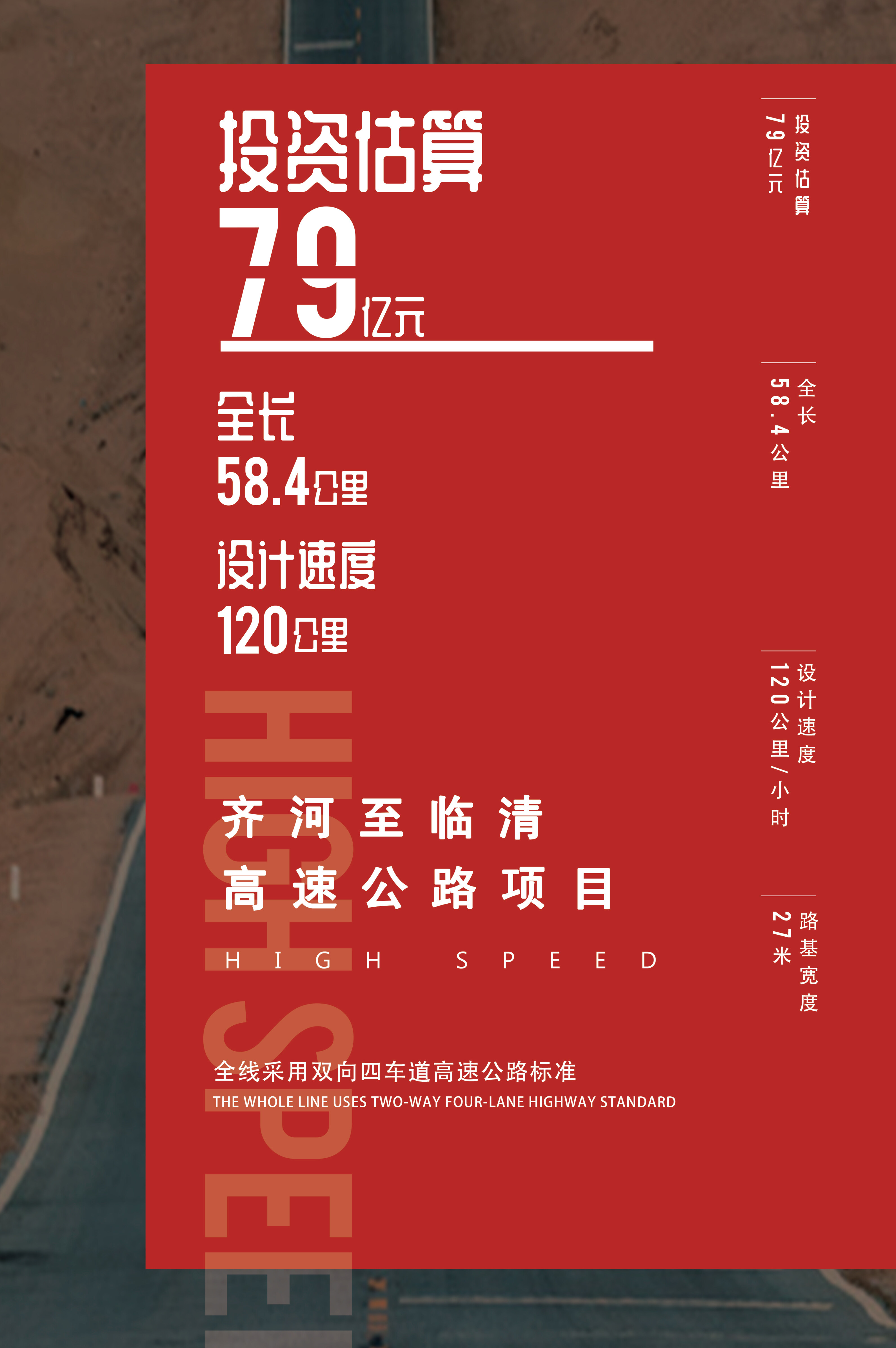齐河至临清高速公路项目:全长58.4公里,投资估算79亿元。工可推荐方案路线起自德州市齐河县潘店镇孙堂村西的济聊馆高速公路上,经潘店镇北、琉璃寺镇南、胡屯乡北、韩屯镇北、菜屯镇北、康庄镇南,终点顺接德上高速临清高速公路连接线,并设对角双环式枢纽与德上高速联接。全线采用双向四车道高速公路标准,设计速度120公里/小时,路基宽度27米。