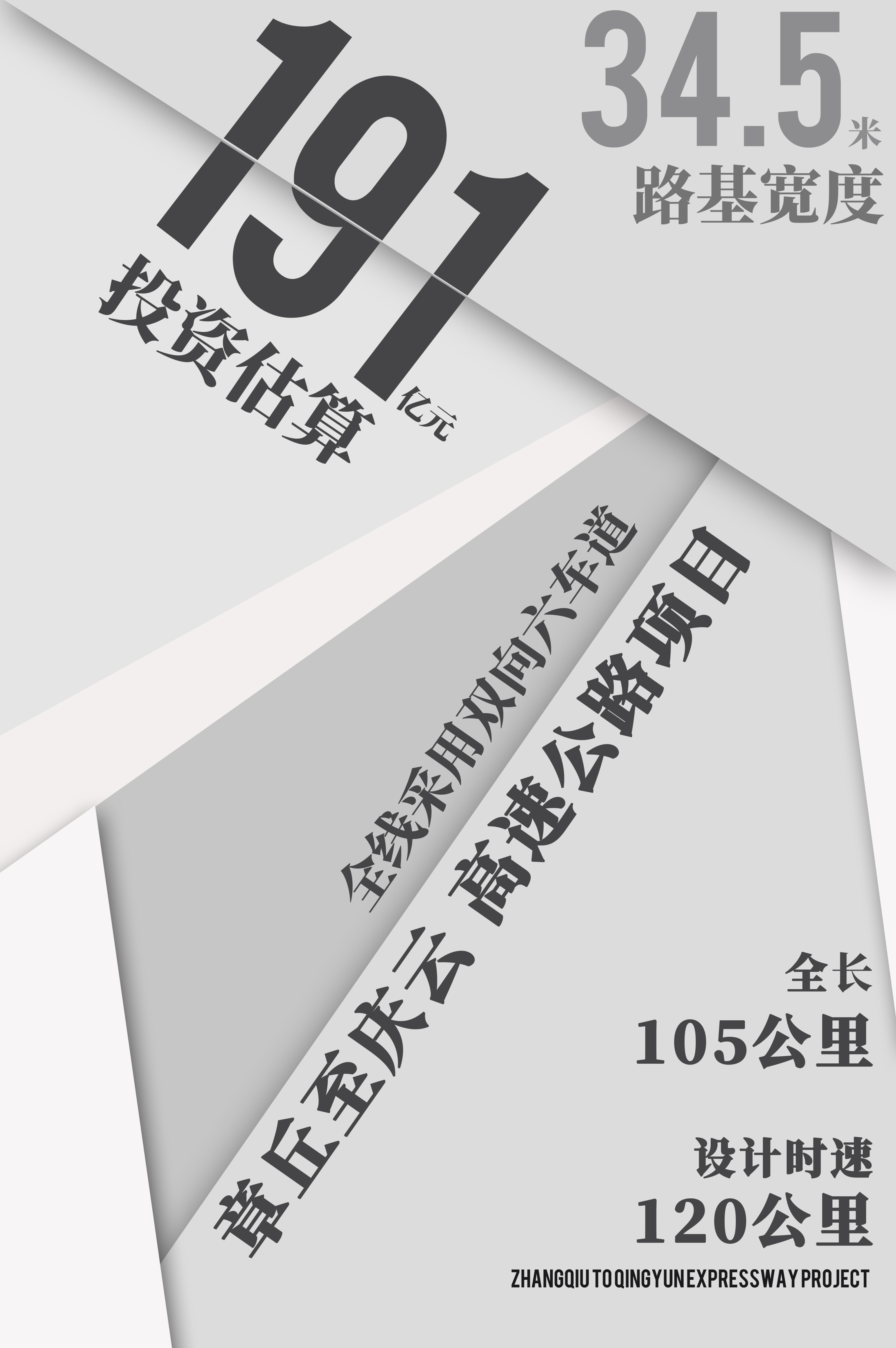 章丘至庆云高速公路项目:全长105公里,投资估算191亿元。鉴于项目省界节点尚未与河北对接,项目起自无棣县水湾镇北部长深高速,经无棣与阳信县西、惠民东、高青西、邹平西,至章丘刁镇接青银高速,接规划章丘东环高速。全线采用双向六车道高速公路标准,设计速度120公里/小时,路基宽度34.5米。