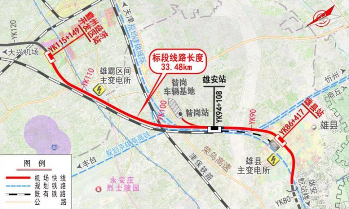 雄安新区至北京大兴国际机场快线项目全长86.21公里,共设站8座,是支持北京非首都功能疏解的区域快线,是雄安新区对外交通“四纵两横”的“一纵”。二标段范围为高架起点至霸州经济开发区站(含),线路长33.48公里,工程内容为3座高架站和3个高架区间。