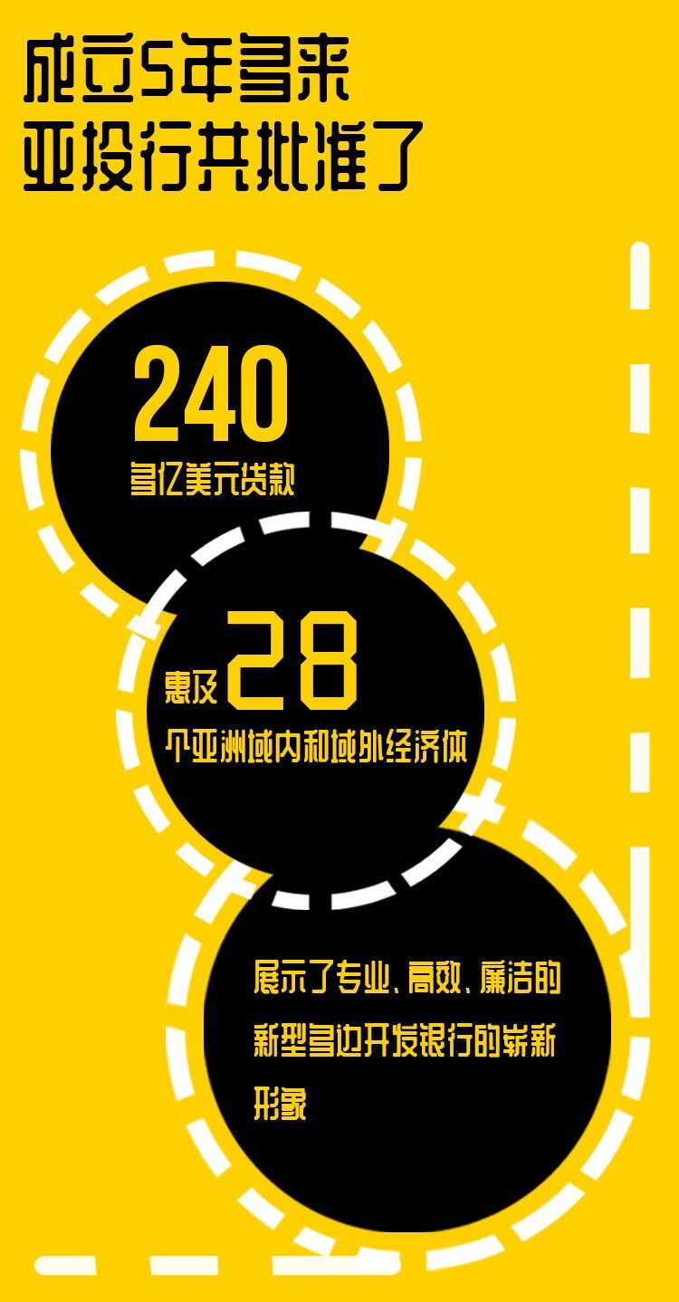 成立5年多来,亚投行共批准了240多亿美元贷款,惠及28个亚洲域内和域外经济体,展示了专业、高效、廉洁的新型多边开发银行的崭新形象。