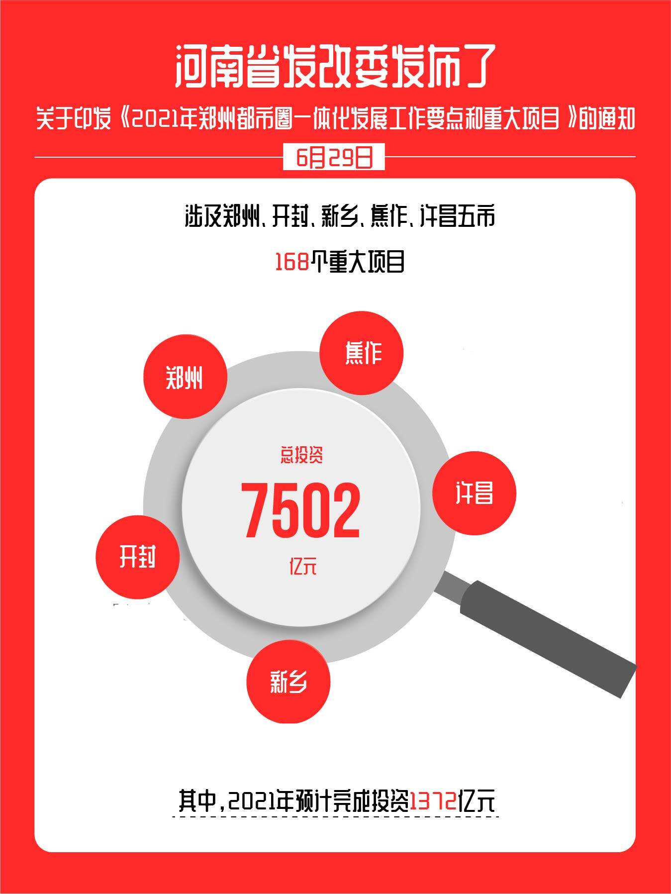 区域协同发展已成为城市圈建设的重要方向。6月29日,河南省发改委发布了“关于印发《2021年郑州都市圈一体化发展工作要点和重大项目》的通知(以下简称《通知》)”,记者梳理工作要点和重大项目发现,涉及郑州、开封、新乡、焦作、许昌五市的168个重大项目,总投资7502亿元。其中,2021年预计完成投资1372亿元。