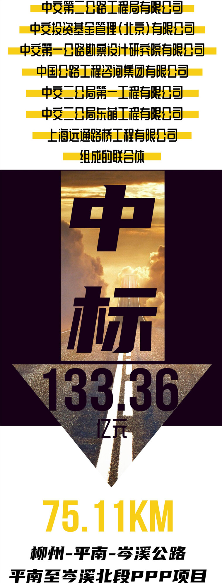 2021年6月30日,广西壮族自治区公共资源交易中心发布柳州-平南-岑溪公路(平南至岑溪北段)PPP项目社会资本中标候选人公示,中交第二公路工程局有限公司、中交投资基金管理(北京)有限公司、中交第一公路勘察设计研究院有限公司、中国公路工程咨询集团有限公司、中交二公局第一工程有限公司、中交二公局东萌工程有限公司、上海远通路桥工程有限公司组成的联合体中标该项目,项目总投资估算约为133.36亿元。